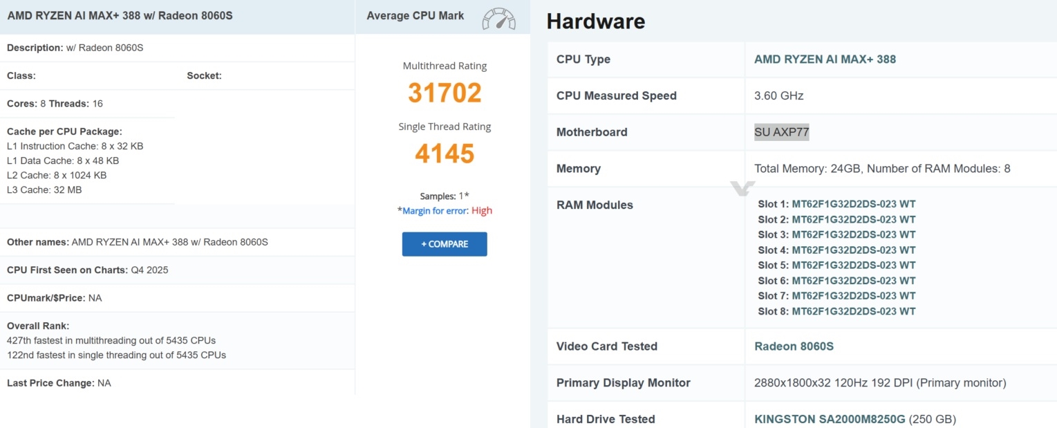 AMD’nin Strix Halo tabanlı yeni Ryzen AI MAX+ 388 ve MAX+ 392 APU’ları, PassMark platformunda görünmeye başladı. Serinin önceki modelleri gibi yapay zekâ hızlandırıcılarına odaklanan bu işlemciler, oyun tarafında tam teşekküllü RDNA 3.5 grafik birimini kullanıyor. Ryzen AI MAX+ ailesi büyüyor