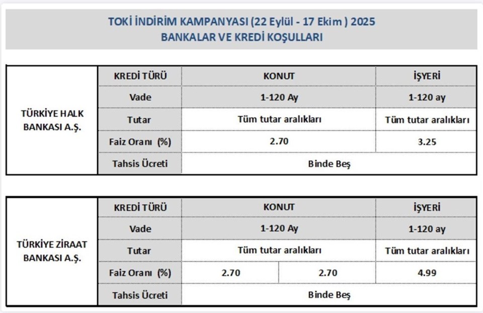 TOKİ’nin resmi internet sitesinde yer alan bilgilere göre; Ziraat Bankası ve Halkbank’ta 120 aya kadar olan konut kredilerinde faiz oranı yüzde 2,70 olarak belirlenmiş durumda. İşyeri alımları için ise Halkbank yüzde 3,25, Ziraat Bankası ise yüzde 4,99 faiz oranı uyguluyor.
